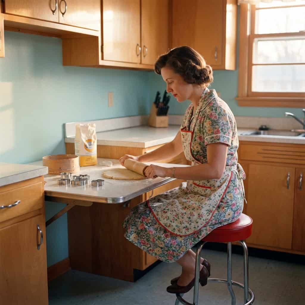 Smart layouts often included a lower counter surface (about 26 inches high) so you could sit with feet flat on the floor while rolling dough.